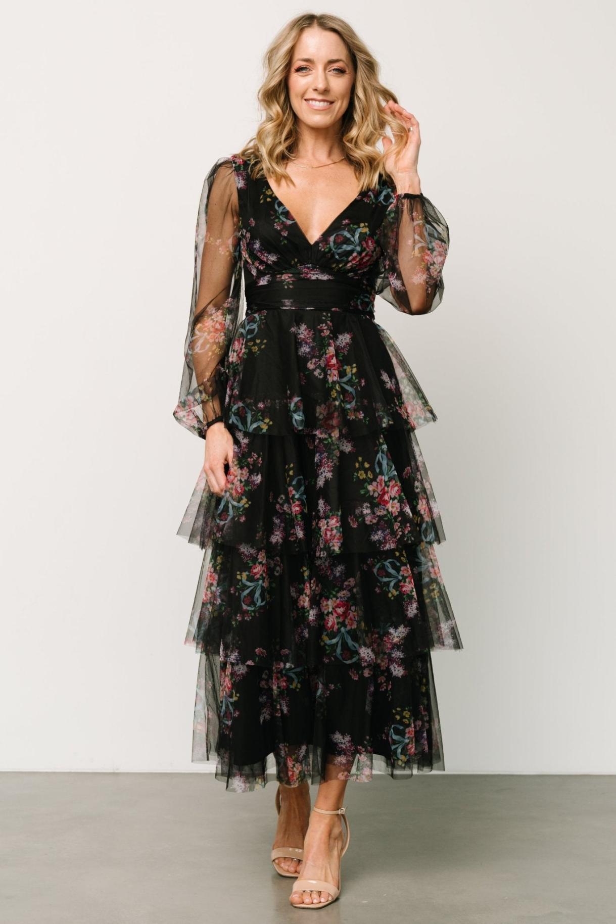 발틱 본 캐롤라이나 튤 티어드 맥시 드레스 블랙 플로럴 | 의류 게스트 드레스